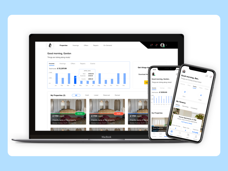 End to end design of the web and mobile dashboard based applications for a lettings and renting digital platform.