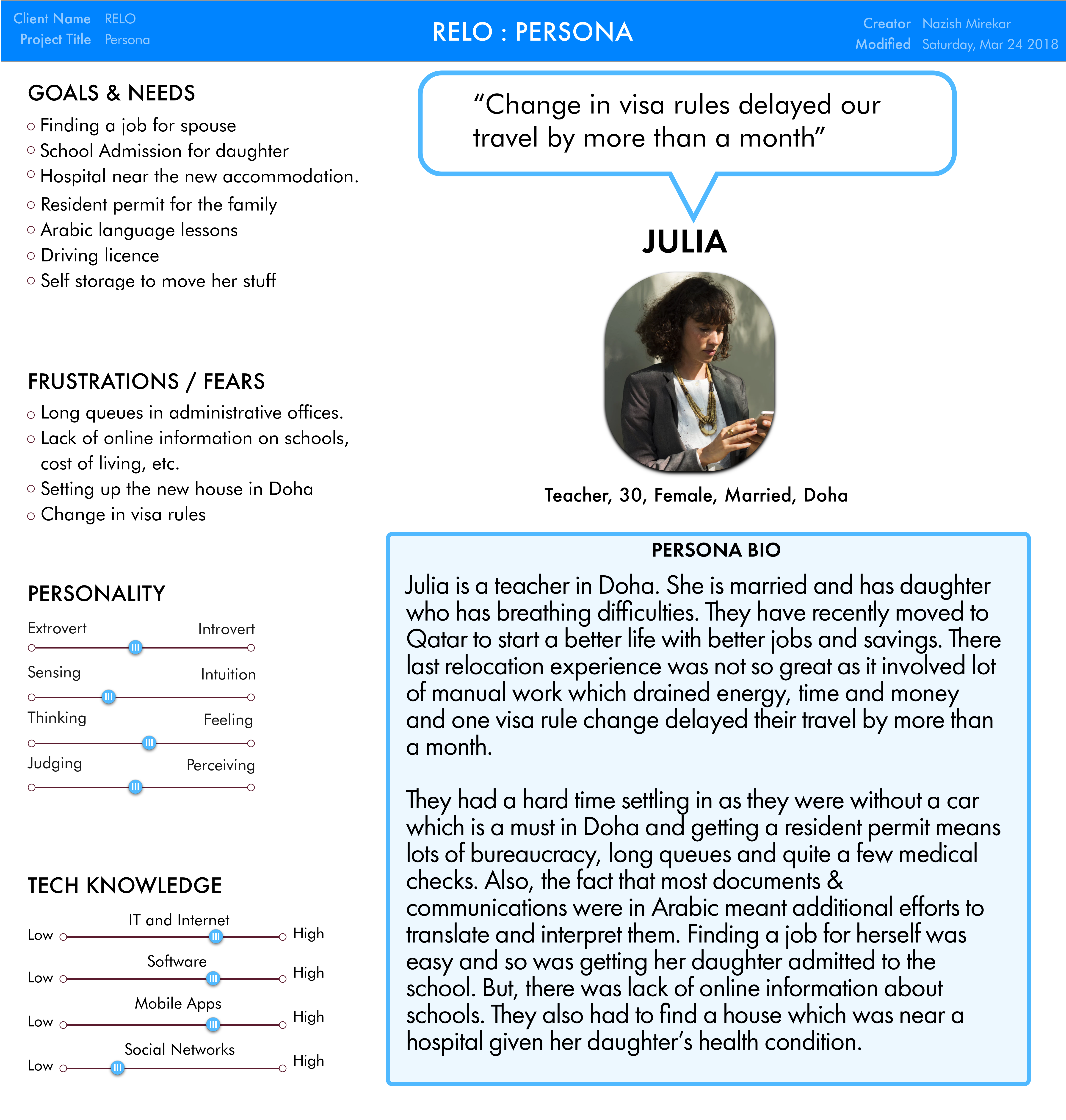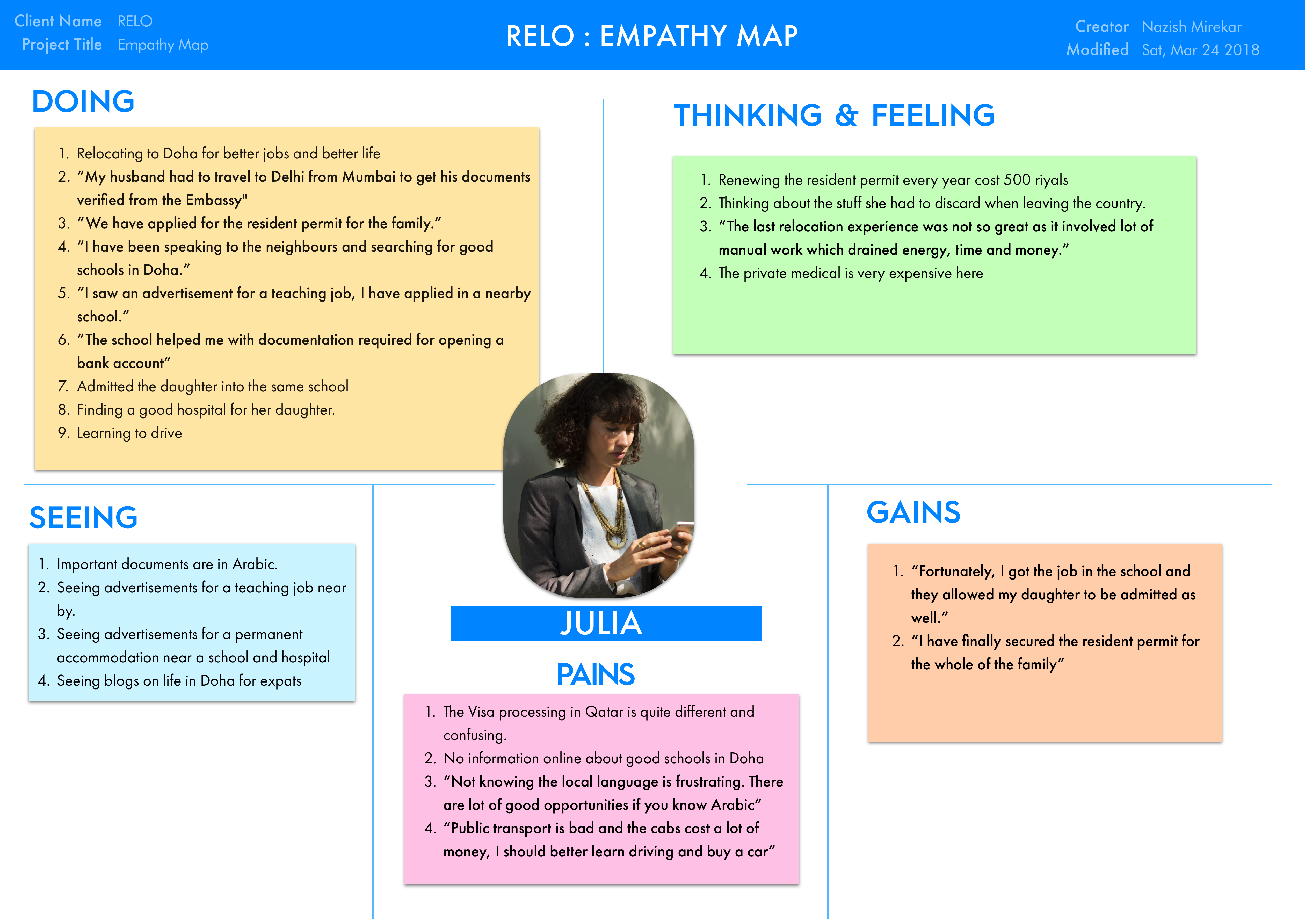 We focused on Julia to create our persona out of this research. She is a teacher in Qatar where she moved 2 years ago. They faced lot of difficulties during their relocation as they missed the visa rule change which delayed their travel by a month.