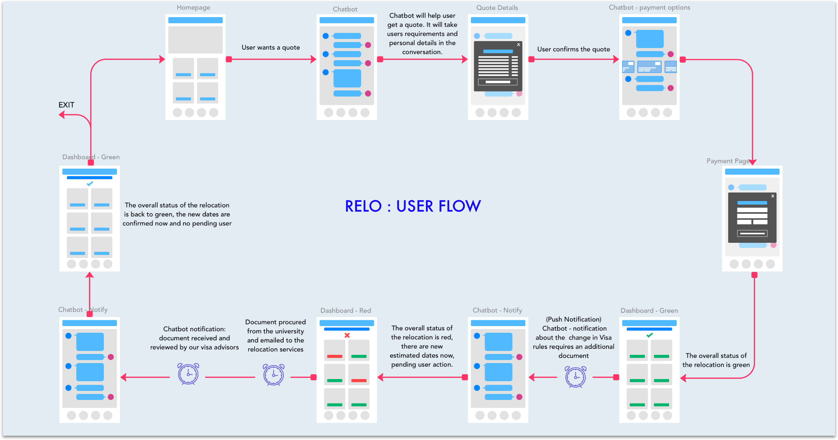 I have focussed on a simple yet important feature of timely notification and effective communication but when backed up by a powerful AI, the bots can be designed to be very effective in answering questions and solving user problems. I also focussed on designing a dashboard that gives the user a single place to manage their relocation.
