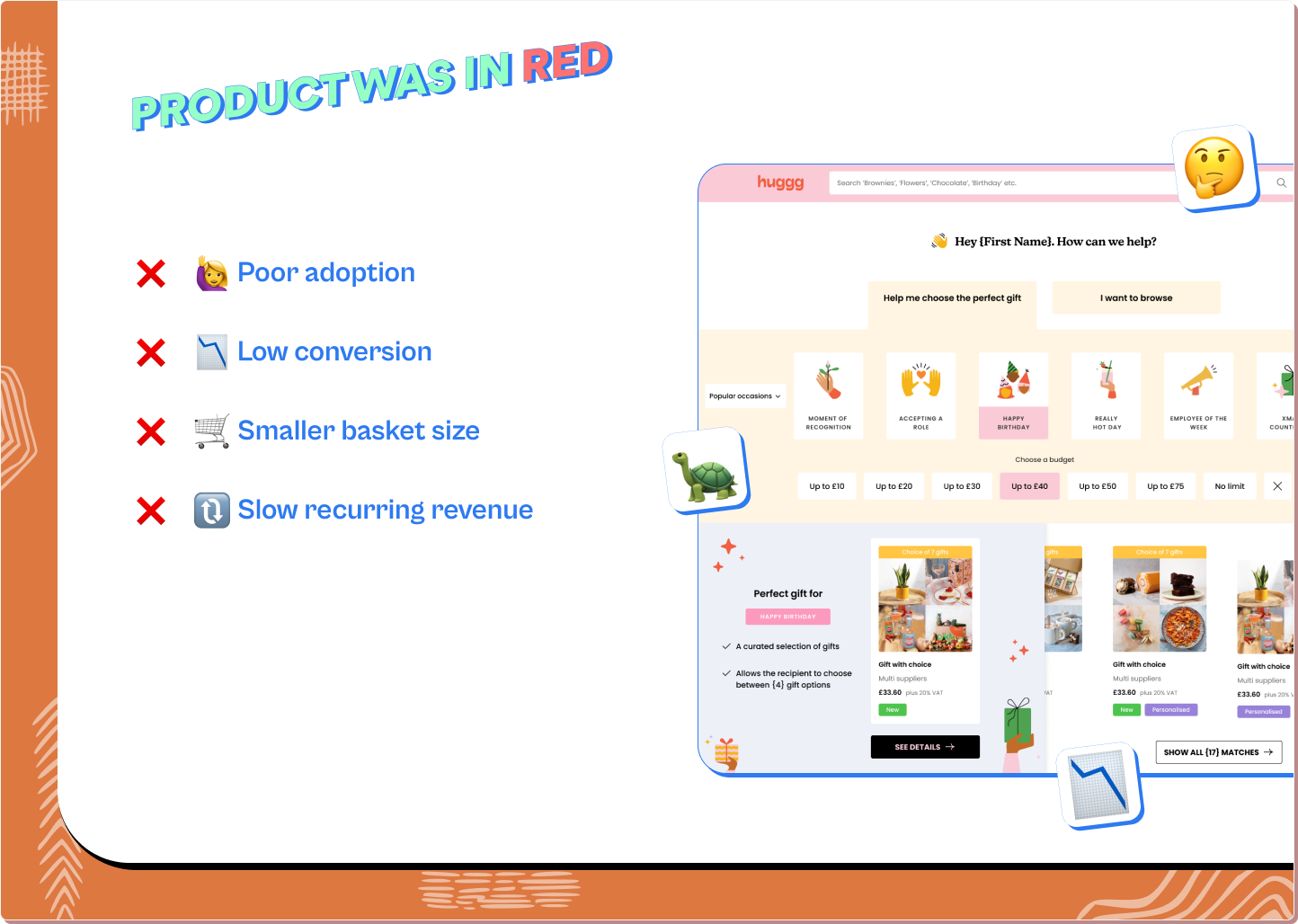 Led product design for a B2B SaaS gifting business, significantly increasing MAU and fostering a strong customer base with high retention. Managed product design for Huggg’s public sector, overseeing substantial annual turnover. Successfully pivoted the platform to support local authorities. Introduced licensing and gated features through a comprehensive user and buyer research project. Collaborated with cross-functional teams, automated operational tasks, and pioneered a first-principled product design approach for enhanced strategy alignment.